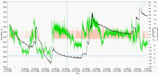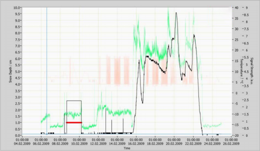 注:黑色曲线表示雪深,绿色表示信号强度,红点是发生了错误,玫红色曲线表示加热。
